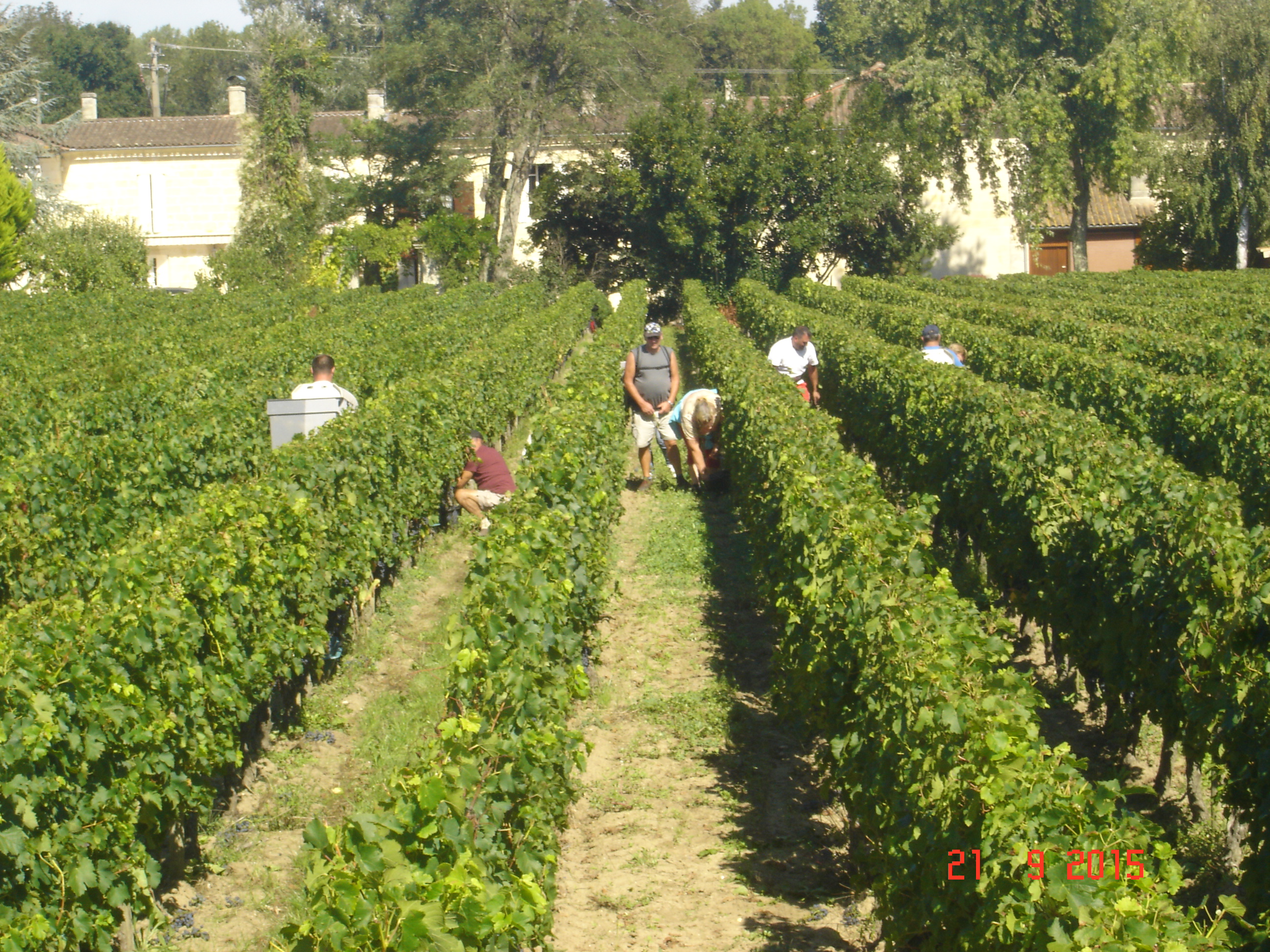 Nous vendangeons à la main. Les coupeurs (au nombre de 12) coupent les grappes avec le sécateur et vide leur panier dans des caisses. Et les porteurs ramènent les caisses pleines jusqu’à la remorque.