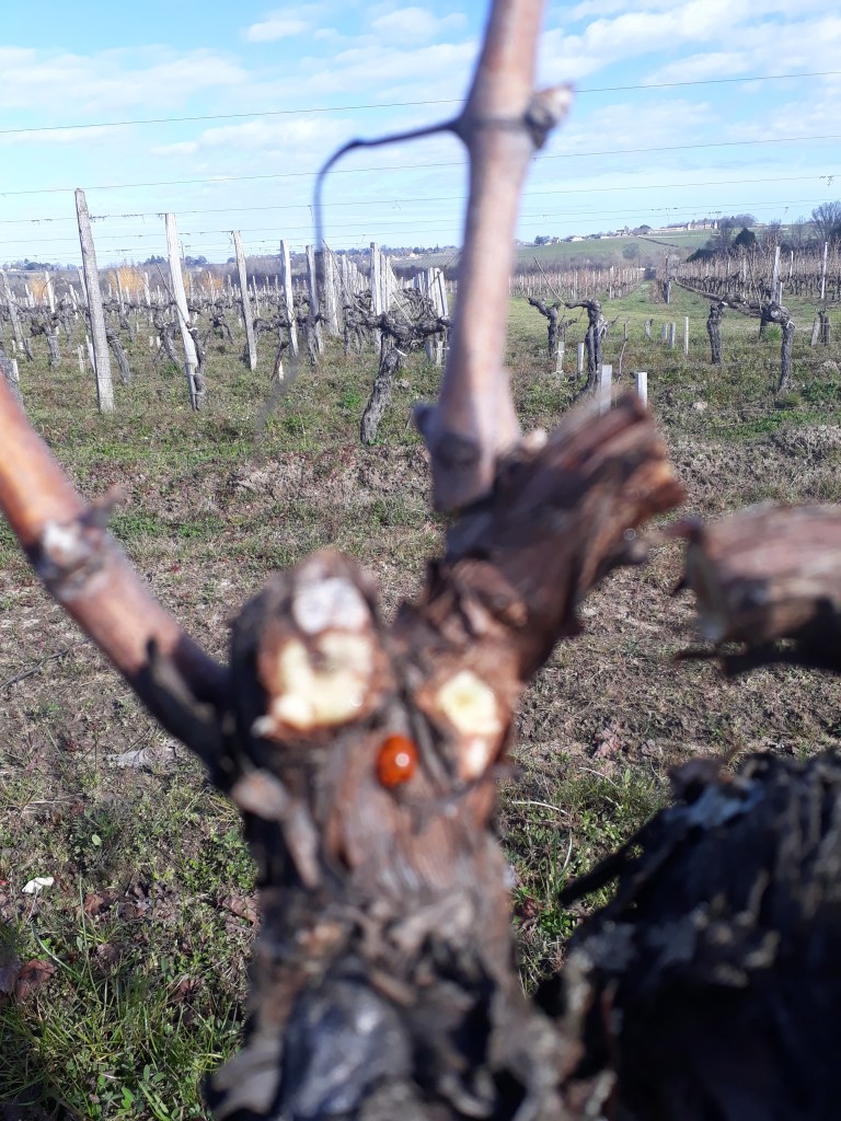 Surprise! 21 février 2021 En finissant de tailler (eh oui, dernière journée de taille), une heureuse rencontre. Une coccinelle! Un peu flou!! Similaire
